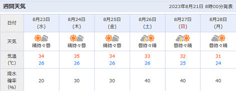 ぎゃ~、殺人高気圧( ゚Д゚)かよ。24日は35℃ですか。