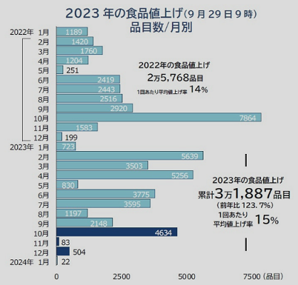 主要な食品メーカー195社における、家庭用を中心とした10月の飲食料品値上げは4634品目となった。酒税引き上げが影響した第3のビールや発泡酒、日本酒など酒類・飲料が約7割を占めたほか、ハム・ソーセージなど加工食品やアイス・氷菓類、チョコレート菓子など再値上げとなった食品もあり、単月としては年内で3番目、22年以降では4番目に多い水準となった。