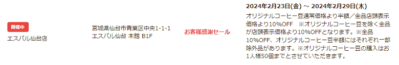 エスパル仙台のカルディでコーヒー豆半額セールがあったのさ♪