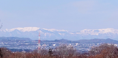 裸の桜の木の向こうには蔵王連峰がくっきり。