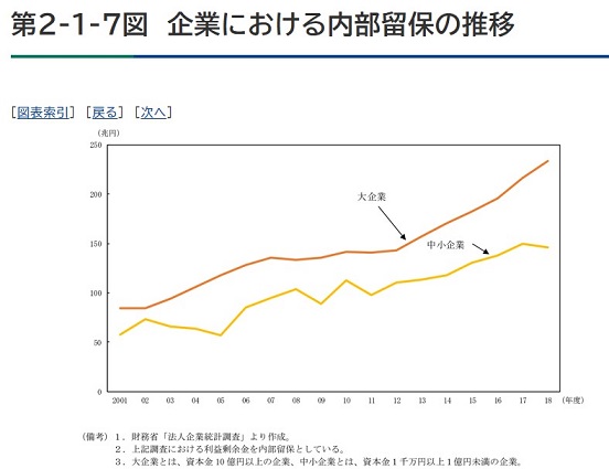 でも、この表で一目瞭然だけどさ。企業の内部留保額は右肩上がりだよ?