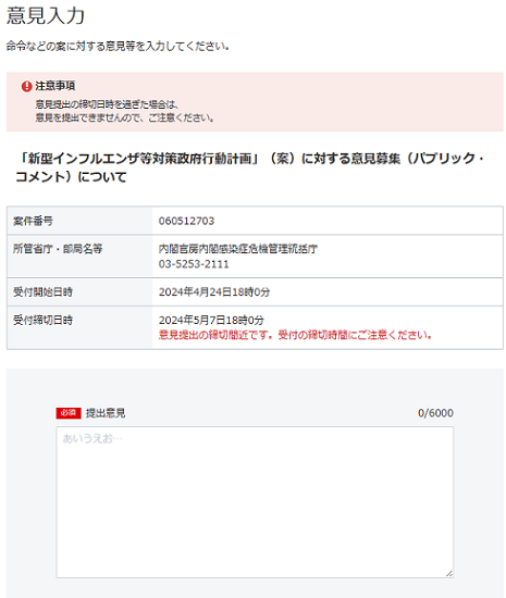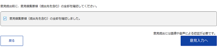 【e-govパブリック・コメント】のページの下「意見募集要領(提出先を含む)の全部を確認しました。」の文章冒頭にあるチェックボックスにチェックをつけると、右下の「意見入力へ」が青くなるから、そこをクリックだぞ(^^v