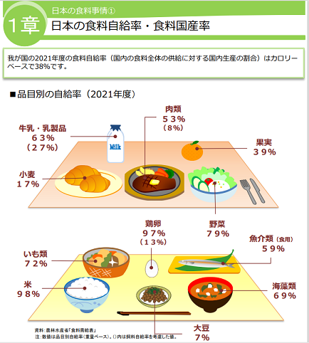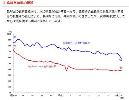 更に驚くのが、食料自給率の低さだよね。農水省の資料だと、カロリーベースで、なんと38%しかない!