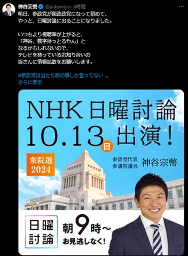 10/13の「NHK日曜討論」には出演出来るようだ。